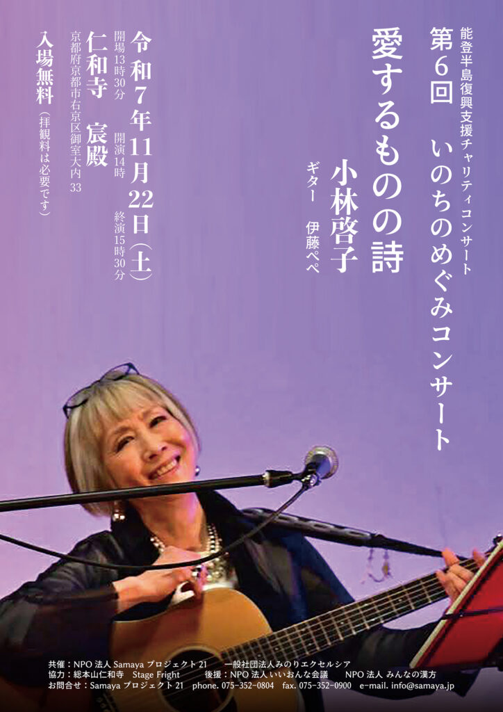 また、11月22日(土)には、第6回「いのちのめぐみコンサート」が仁和寺御所庭園宸殿にて開催されます。秋の1日、ぜひ