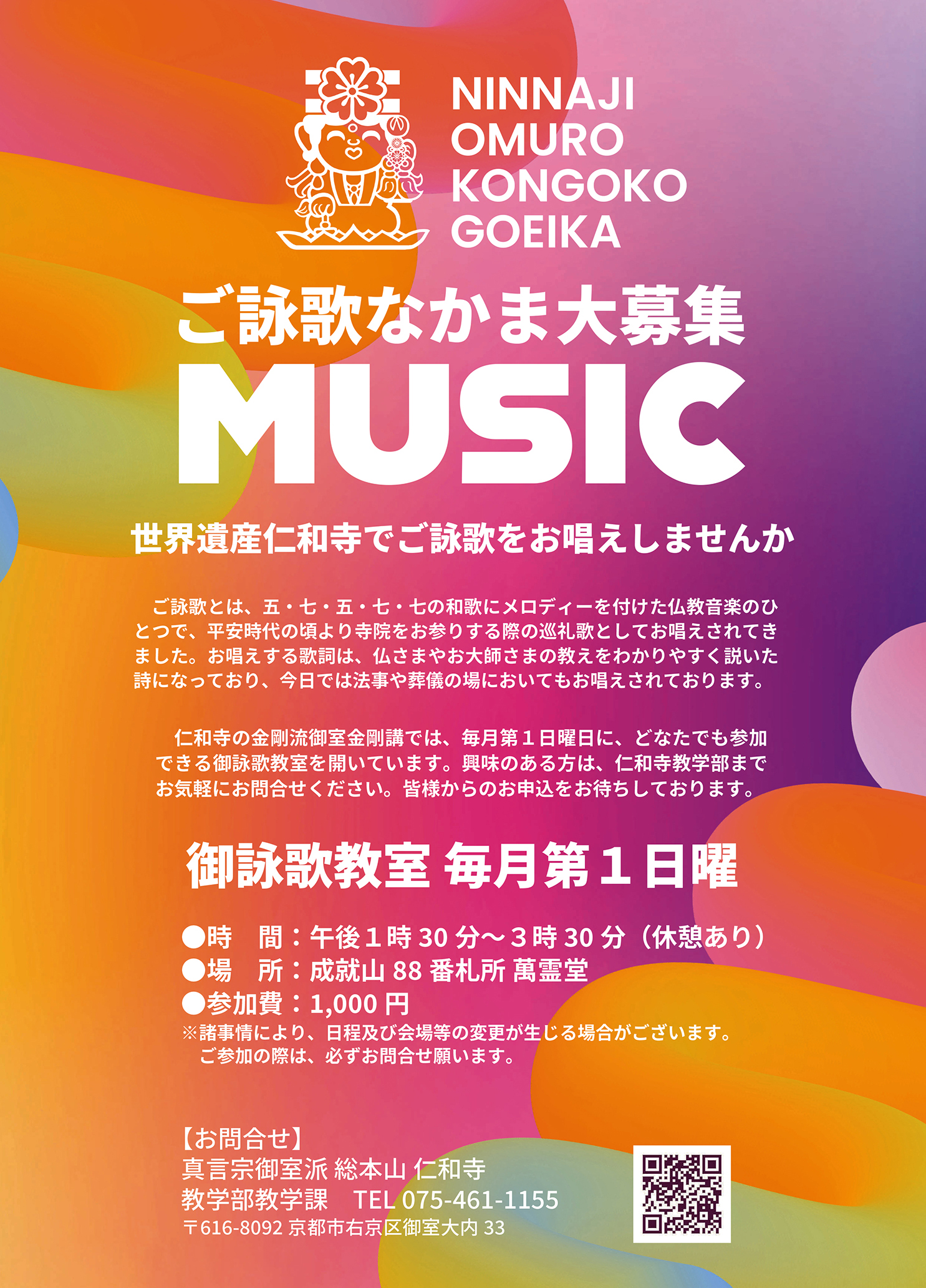 仁和寺の金剛流御室金剛講では、毎月第1日曜日に、どなたでも参加できる御詠歌教室を開いています。ご興味のある方は、仁和寺教学部(075-461-1155)までお気軽にお問い合わせください。