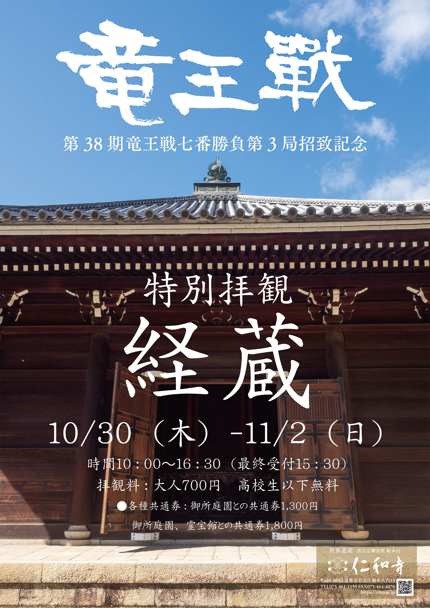⭐️令和7年10月31日、11月1日の2日間に渡って仁和寺御所庭園宸殿にて開催の第38期竜王戦七番勝負第3局の招致を記念し重要文化財 「経蔵」特別拝観を行います。
