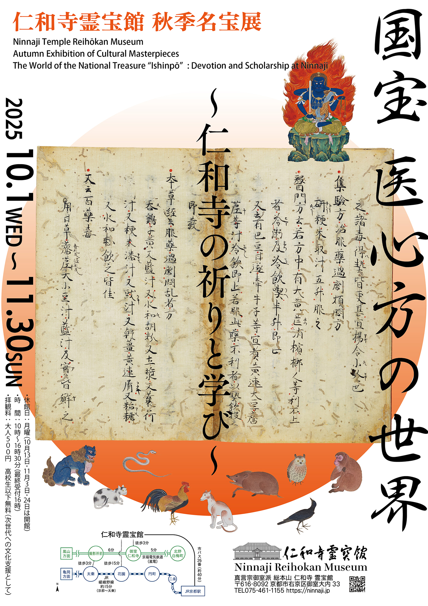 10月1日(水)より仁和寺霊宝館において秋季名宝展を開催いたします。今回は「国宝 医心方の世界〜仁和寺の祈りと学び」と題しまして、日本での現存最古の医学書「国宝 医心方」を中心に宝物を展示公開いたします。秋の1日、紅葉の仁和寺へどうぞ足をお運びください。